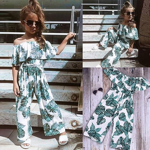 AnFeng Girls Short Jumpsuits Off Print Toddler Romper Ruffles Kids Shoulder Girls Jumpsuit Clothes Leaf Girls (Green, 140)