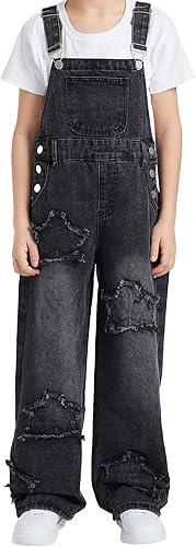 Girls Denim Overalls Star Patchwork Wide Leg Bip Jeans Jumpsuit Adjustable Straps Dungarees Pants With Pockets 8-13Years