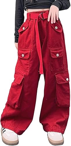Cargo Pants for Girls High Waist Track Pant Streetwear Casual Hip Hop Joggers Loose Y2k Cargo Pants (Red, 13-14 Years)