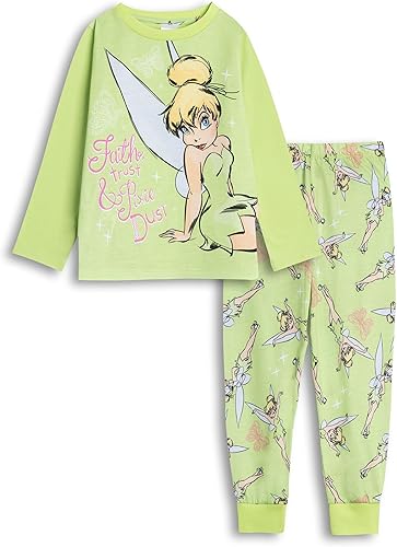 Disney Tinkerbell Girls Green Long Sleeve Long Leg Pyjama Set | Inspirational Print Kids Sleepwear Loungewear Merch