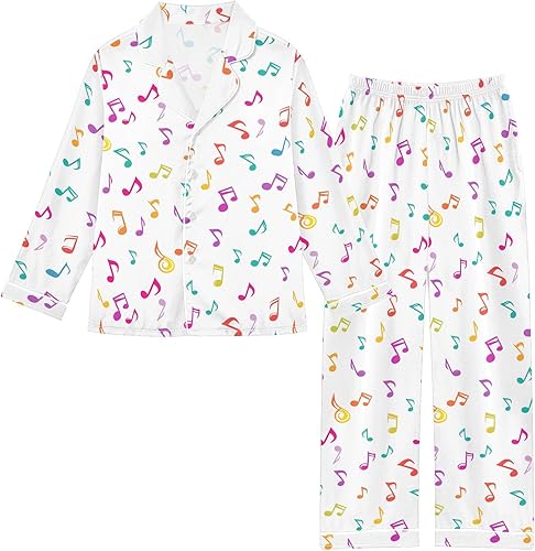 Satin Pajamas Set, Musical Notes Pattern Button Down Long Sleeve 2 Piece PJ Set 5-14Y Multicolor