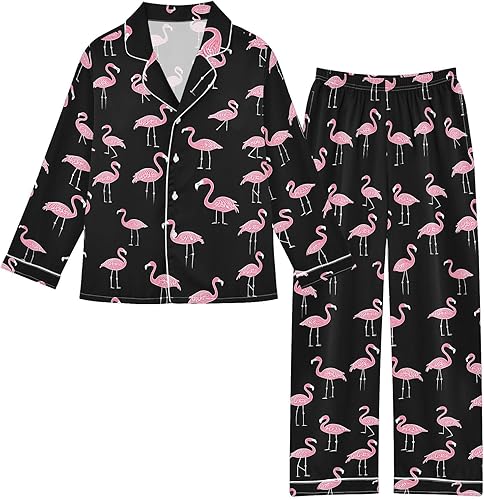 Cute Long Sleeve Pajamas Set Soft Silk Satin Sleepwear 2 Piece Button-Down Top Elastic Pants Set