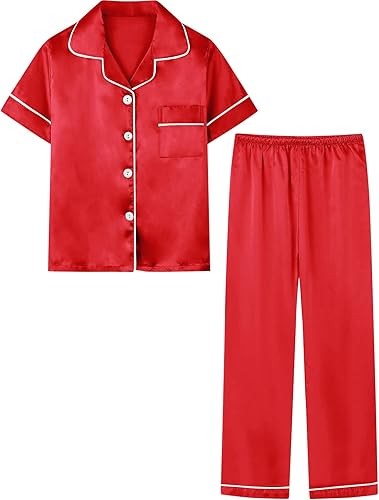 Umeyda Girls Pajamas, Satin Pjs Silk Sleepwear Comfy Family Matching 2Pcs Lightweight Loungewear Gift for Teen Kids, Red, 10-11 Years = Tag 150