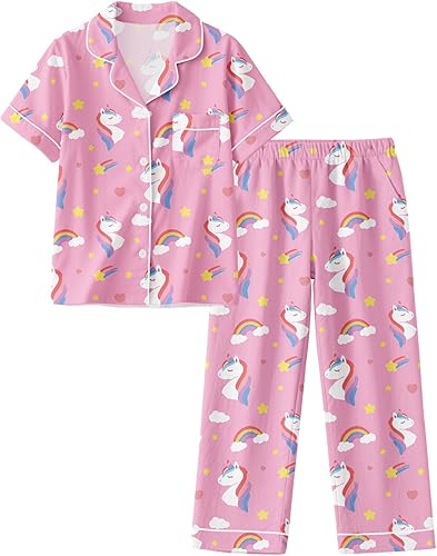Betusline Girls Pajama Sets, 2pcs Button Down Short Sleeve with Lounge Pants Sleepwear, Rainbow Unicorn-Pink, 9-10 Years = Tag 150