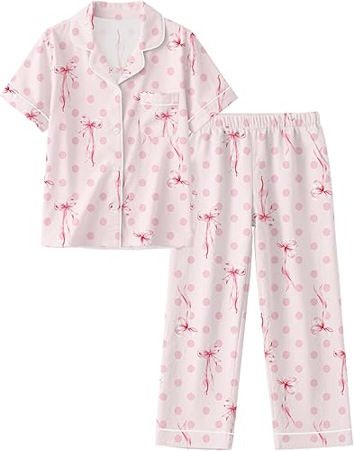 Girls Button Down Pajamas Sleepwear 2pcs Short Sleeve with Long Pants Set, 5-14 Years