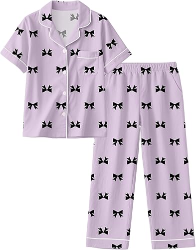 Betusline Girls Pajama Sets, 2pcs Button Down Short Sleeve with Lounge Pants Sleepwear, Bow Purple, 5-6 Years = Tag 130