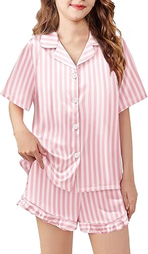 DIPUG Girls Pajamas Satin Pajama Set Silk Pjs Short Sleeve Sleepwear