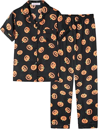 Black Pumpkin Halloween Satin Pajamas for Big Girls Silk Button Down Short Sleeve & Pants PJS 2PCS Size 8-16