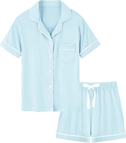 SANGTREE Girls' Short Pajama Sets Button Down Cotton Sleepwear 2PCS Lounge Sets Nightwear, Light Blue, 5-6X = Tag 130
