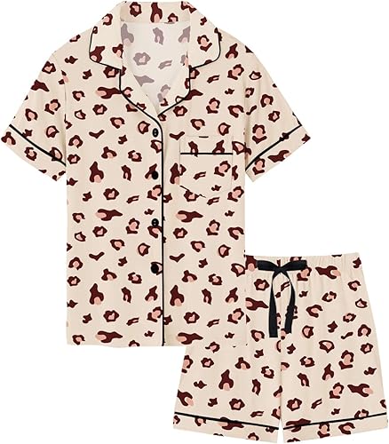 SANGTREE Girls' Short Pajama Sets Button Down Cotton Sleepwear 2PCS Lounge Sets Nightwear, Brown Leopard, 5-6X = Tag 130