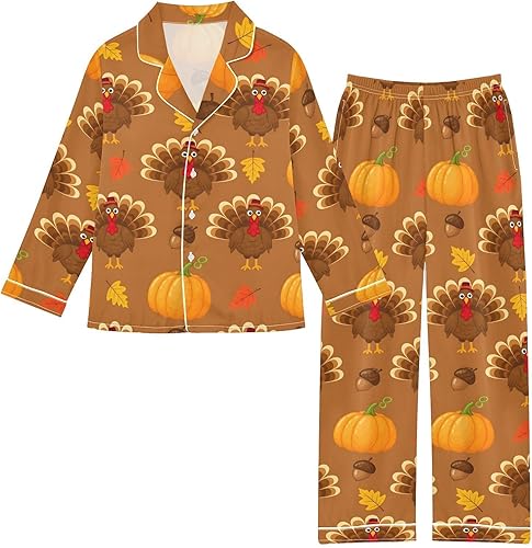 Satin Pajama Sets Long Sleeve Thanksgiving Pattern with Turkeys Pumpkins Button Down Silky Nightwear 2 Piece PJS 5-14Y