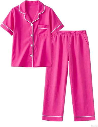 Girls Button Down Pajamas Sleepwear 2pcs Short Sleeve with Long Pants Set, 5-14 Years