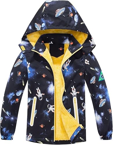 Astronaut Print Rain Jacket Toddler Girls Fall Cute Windbreaker Zipper Raincoat Boy Outdoor Warm Fleece Hooded Outerwear