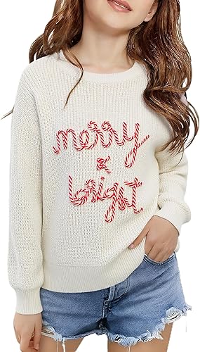 SELINK Girls Christmas Sweater Striped Merry and Bright Letter Sweaters Kids Long Sleeve Casual Xmas Pullover Top