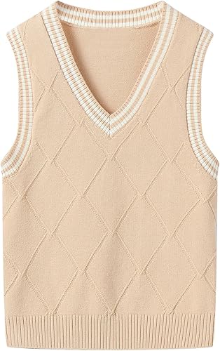 Boys Girls V Neck Cable Knit Sweater Vest Cotton Striped Trim Argyle School Uniform Vests 3T-8Y