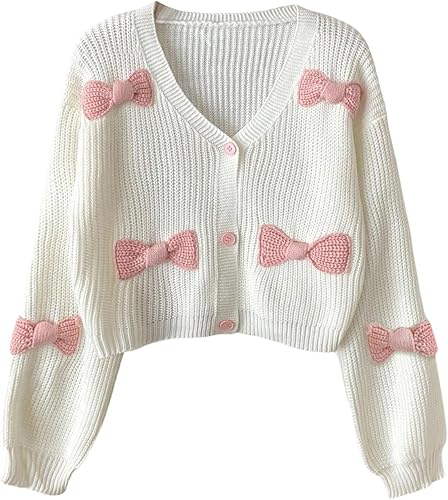 MakeMeChic Girl's Bow Knot Long Sleeve Cardigan V Neck Button Down Cute Fall Sweater Knitwear