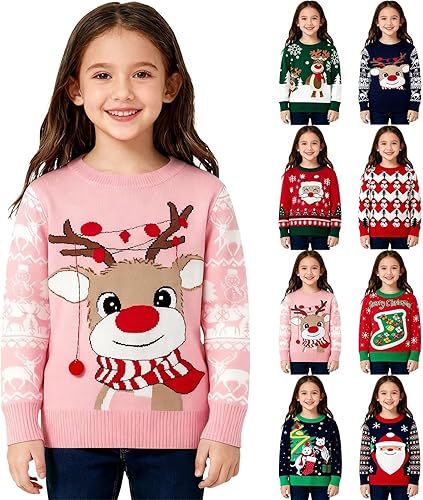 Kids Girls Christmas Sweater Knitted Graphic Crewneck Pullover Top Toddler Boys Warm Long Sleeve Holiday Clothes