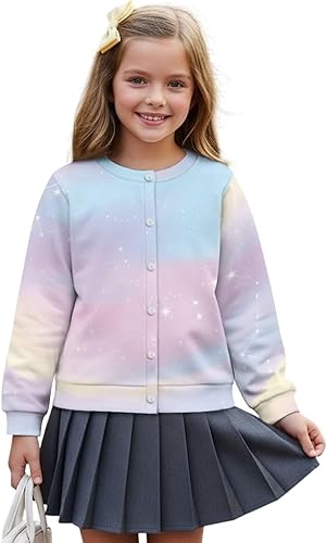 Wanyint Girls Lightweight Cover Up Cardigan, Long Sleeve Printed Crewneck Button Front Layer, Machine Washable, Ages 5-16