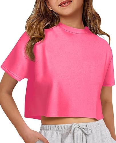 ZDC Girls Athletic Oversized Crop Tops Kids Drop Shoulder Short Sleeve T Shirts Workout Tees 5-14 Years Hot Pink