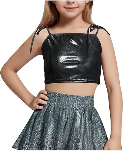 Girls Shiny Metallic Sequin Spaghetti Straps Tops Kids Lace Up Sleeveless Y2K Streetwear Crop T-Shirts Dancewear Tees