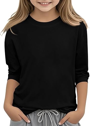 Girls 3/4 Sleeve Crew Neck T Shirt Soft Casual Basic Top for Kids Comfortable Everyday Wear School Outfits