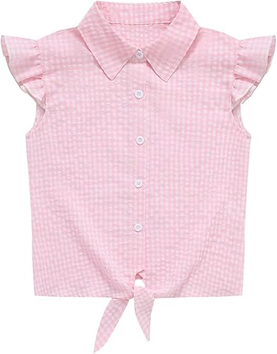 Girls Sleeveless Button Down Shirt Plaid Crop Tank Tops Summer Tie Knot Ruffle Sleeve Shirts Blouses