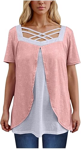 Womens Summer Color Block Fake Two Piece Tunic Tops Plus Size Crisscross V Neck Shirts Short Sleeve Casual Blouse