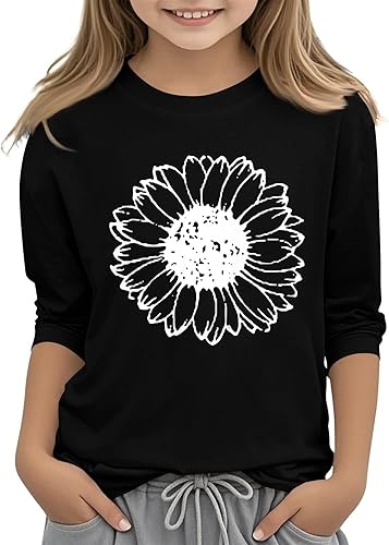Girls Cute Graphic Tees Sunflower T-Shirt 3/4 Sleeve Aesthetic Blouse for Girls Cute Tops Crewneck T-Shirt Tees Blouses