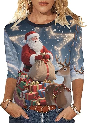 Colorful Happy Vacation Christmas Tops for Teen Girls Fall Summer 3/4 Sleeve Crewneck Spandex Graphic Loose Fit Tops Shirt Blouse Womens 2025 Clothing 3XL