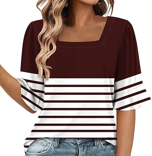Womens Summer Square Neck Tops Color Block Striped Shirts Cute Ruffle Elbow Sleeve Tunic Casual Half Sleeves Blouses