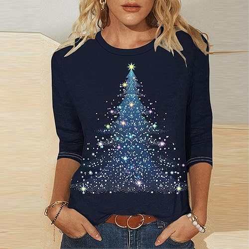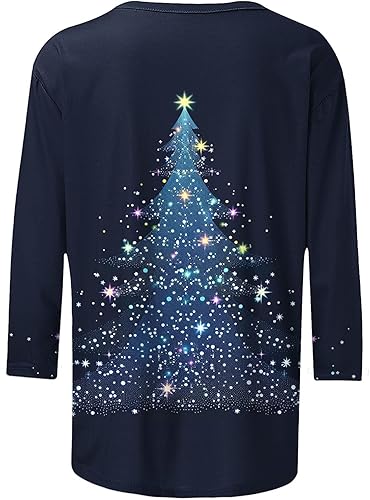 2025 Christmas Shirts for Women 3/4 Sleeve Glitter Xmas Tree T-Shirt Tunic Tops Holiday Party Christmas Clothes Gifts(7#navy,4X-Large)