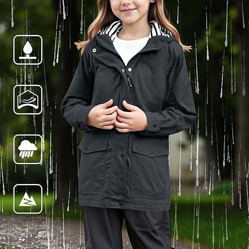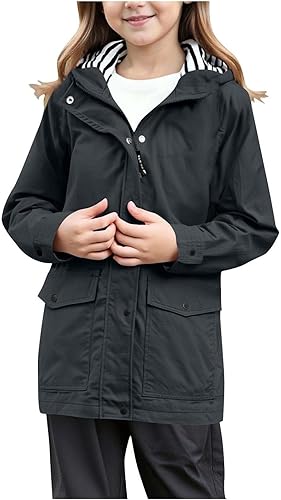 2025 Trendy Boys Girls Waterproof Rain Jacket with Hood Zipper Youth Cotton Lined Button Down Raincoats Windbreaker Outerwear(Black,3-4T)