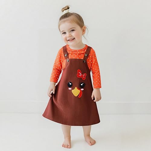 Design: Toddler girl fall dress, long sleeve dots shirt, orange polka dots shirts, brown turkey fall toddler dress, trendy thanksgiving outfit toddler girl for fall winter