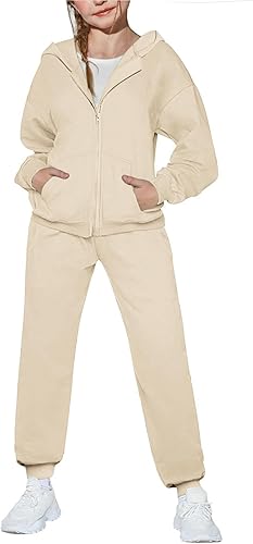 Arshiner Girls 2 Piece Outfits Jogger Sets Zip Up Hoodie Sweatshirts and Sweatpants with Pockets Tracksuits Sweatsuits(Khaki,11-12 Years)