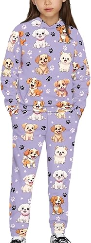 Unique Design--Customed with various fashionable and trendy 3d print such as halloween,christmas pattern,cow print,color splatter,camouflage,leopard print,axolotl,cat,puppy,horse,fire flame,rainbow,mushroom,floral,strawberry,ect,this two-piece kids' tracksuit can be worn together, or it can be worn separately from the pullover sweatshirt and tracksuit pants which can easily pair with leggings, shirt,sweatpants, jeans, athletic shorts for a standout look