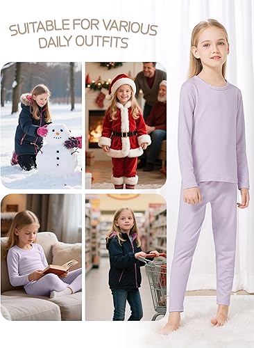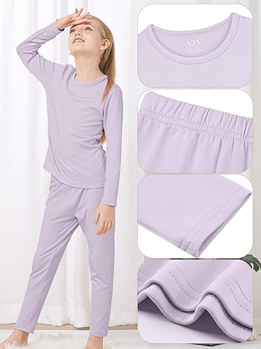 VZV Girls Thermal Underwear Set Thermal Underwear for Kids Fleece Lined Long Johns Kids Base Layer Top and Bottom for Winter(Lavender,Small)