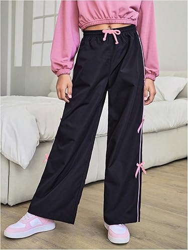 Features: Track pants with bowknot side, elastic high waisted, drawstring, wide leg, loose fit