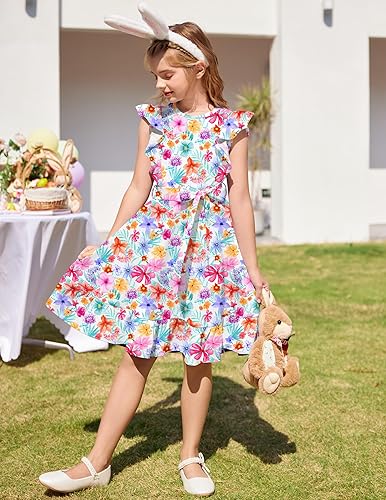 Arshiner Girls Spring Summer Dresses Flutter Sleeve A-line with Belted Pockets Casual Party Dress for Kids 6-16 Years(Colorful Floral,10-12)
