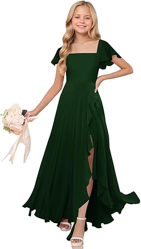 Feature:Elegant ruffle sleeve junior bridesmaid dress featuring a chic slit, delicate chiffon ruffles, and a flattering square neckline. This flowy prom dress for teen girls, perfect for weddings and formal occasions, offering a graceful silhouette with its zippered back closure.
