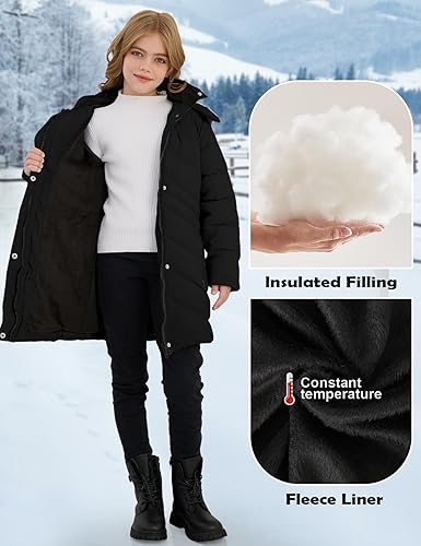 Yimoon Girl's Winter Coat Waterproof Warm Long Quilted Puffer Jacket Fleece Lined Hooded Parka Snow Coats(Black,11-12 Years)