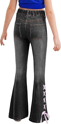 FEESHOW Kids Girls Y2k Bowknot Flared Jeans Stretch High Elastic Waist Wide Leg Bell Bottom Denim Pants Summer Trousers(Black,16 Years)