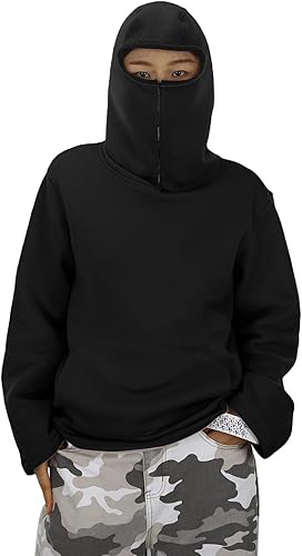 Balaclava Hoodie with Built in Balaclava Boys Girls Zip up Masked Ninja Jacket Fleece Pullover Sweatshirt Size 10-12(02-black,15-16 Years)