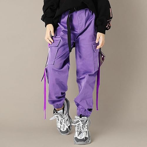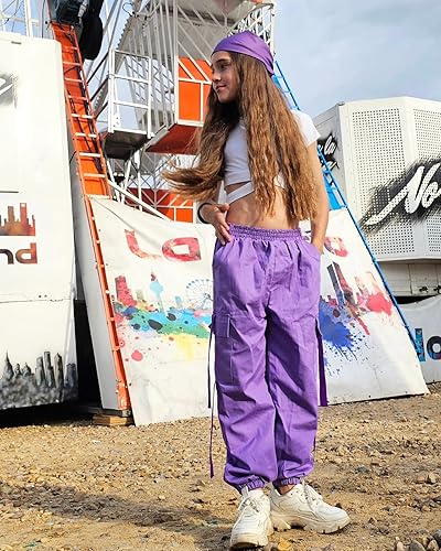 Rolanko Girls Cargo Pants for Kids Loose Streetwear Hip Hop Dance Cotton Cargo Jogger Pants for Kids 4-15 Years(Purple,12-14)