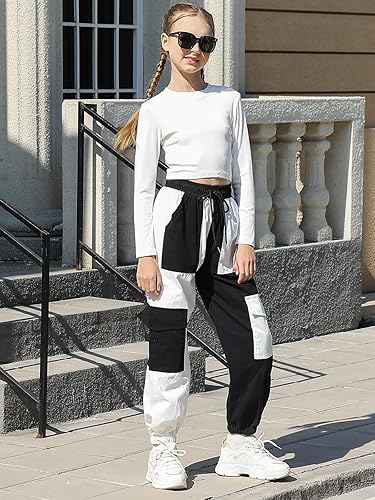 Girls Cargo Pants Elastic Waist Casual Jogger Pants for Girls Streetwear Loose Parachute with Pockets 7-14Years(Black and White,11-12 Years)