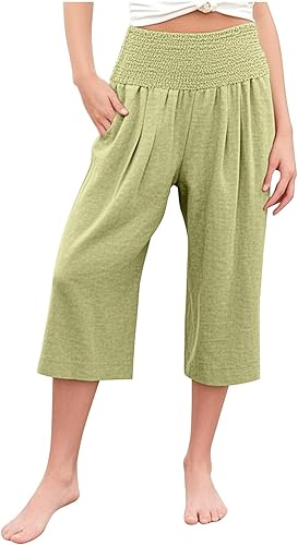 Teen Girls Palazzo Linen Capri Pants Loose Fit Solid Smocked Waist Wide Leg Capris Summer Casual Beach Vacation Pant