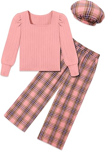 [GIRLS 3 PIECE OUTFIT]: This teen girl clothes includes a girls puff long sleeve shirt, an elastic waist girls wide leg plaid pants (with two pockets), and an adjustbale hat that suits all kids head sizes