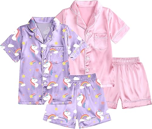 • Feature: Boys girls silk pajamas set, soft and silky short sleeve tops with single-breasted closure, one front pocket, turn-down collar, matching elastic waistband shorts