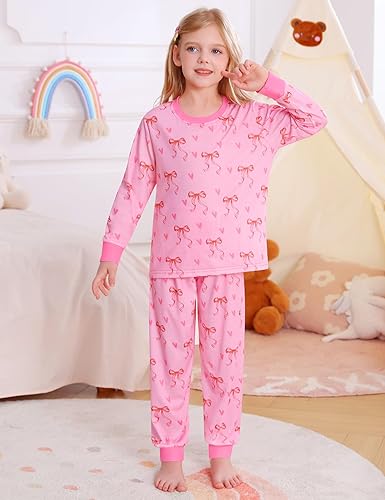 SWOMOG Girls Pajama Sets Kids 2 Piece Pj Set Long Sleeve Top and Pants Girls Sleepwear Soft Bow Print Lounge Set 4-14 Years(Pink Bow,14-15 Years)