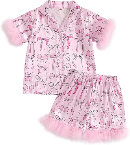 Hekkomird Toddler Girl Summer Pajamas Set Bow Print Lapel Short Sleeve Button Down Shirt Elastic Shorts Kids Pjs Sleepwear