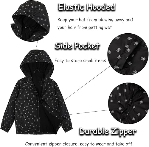 This ultra-light girls rain jacket is very easy to be packed in kids school bags,The elastic cuffs and full zipper design make your child warm.